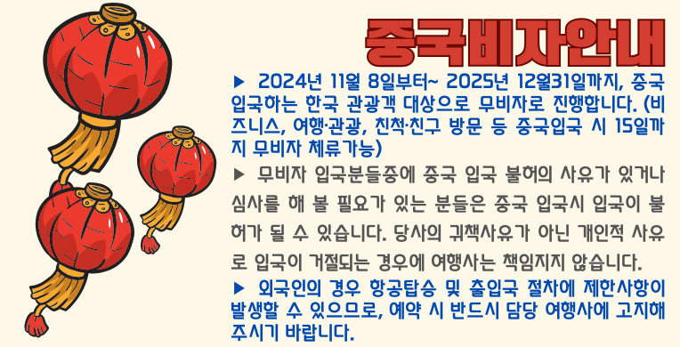 - 여행 취소 시 비자발급비용은 취소료와 관련한 여행경비에서 제외하고 별도로 책정/부과됩니다. 비자 비용은 환불이 되지 않습니다.