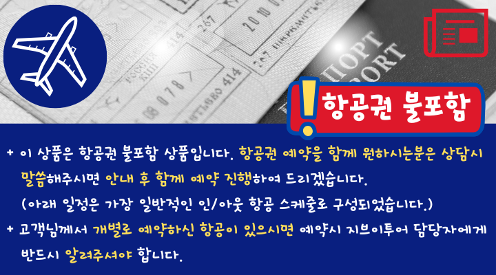 - 여행상품의 항공권은 항공사 정책에 따라 출발일별, 예약일별로 가격이 다를 수 있으며, 예약시점과 항공좌석상황에 따라 추가요금이 발생 될 수 있으니, 예약 후 반드시 출발가능여부를 확인해 주시기 바랍니다.